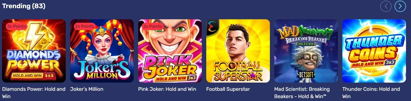 Het casino biedt meer dan 3000 spellen: moderne slots, klassiekers met fruit-thema, megaways, progressieve jackpots, live speeltafels en crash-spellen. Bekende favorieten zoals Big Bass Bonanza, Book of Dead en Gates of Olympus zijn hier te vinden. Live casino wordt aangedreven door bekende studio’s, met roulette, blackjack, baccarat en game shows.